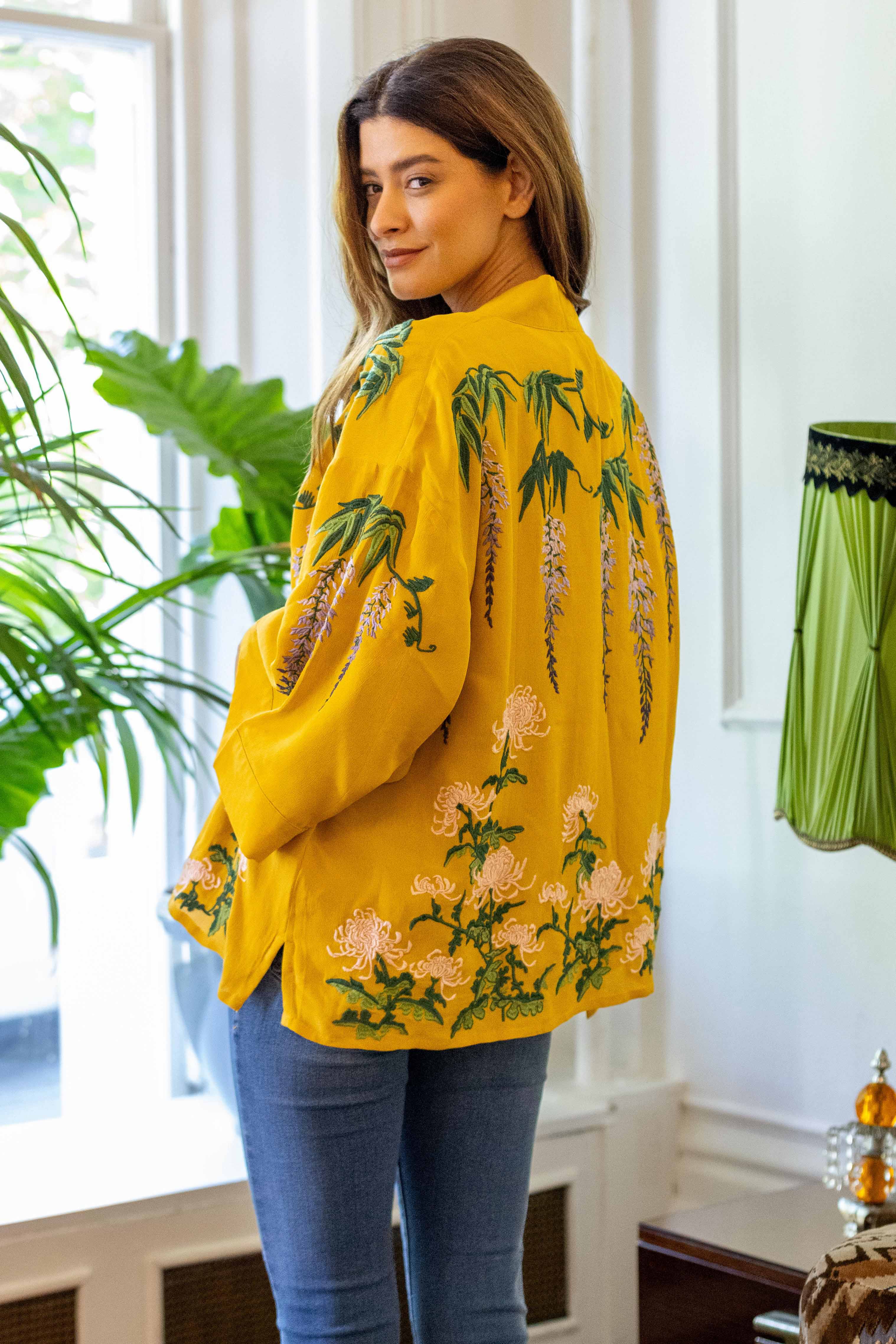 Wisteria & Chrysanthemum Embroidered Mustard Fully Lined Short Kimono