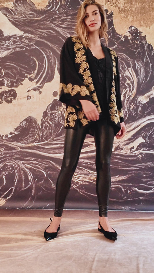 Japanese Pine Needle Embroidered Black and Gold Fully Lined Short Kimono