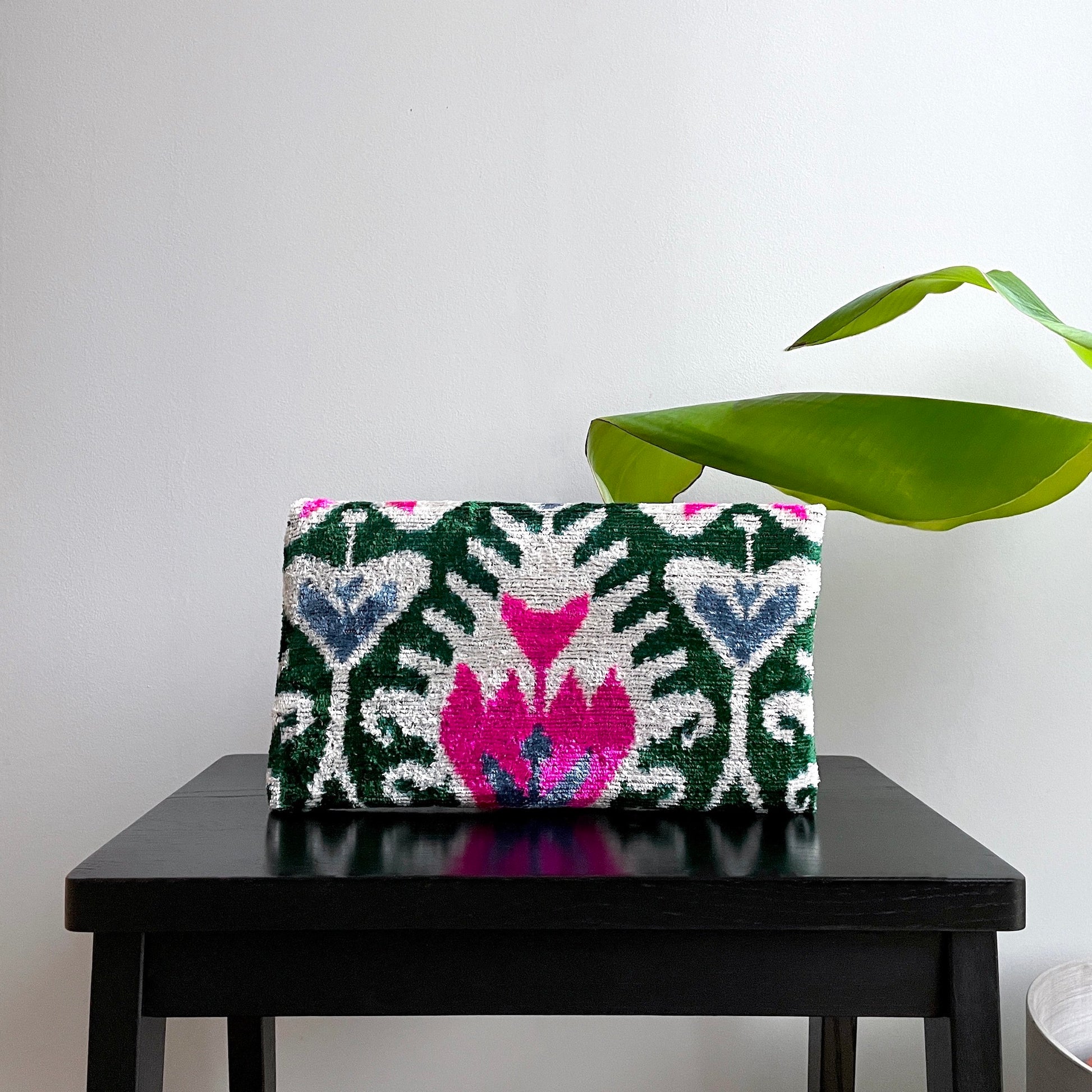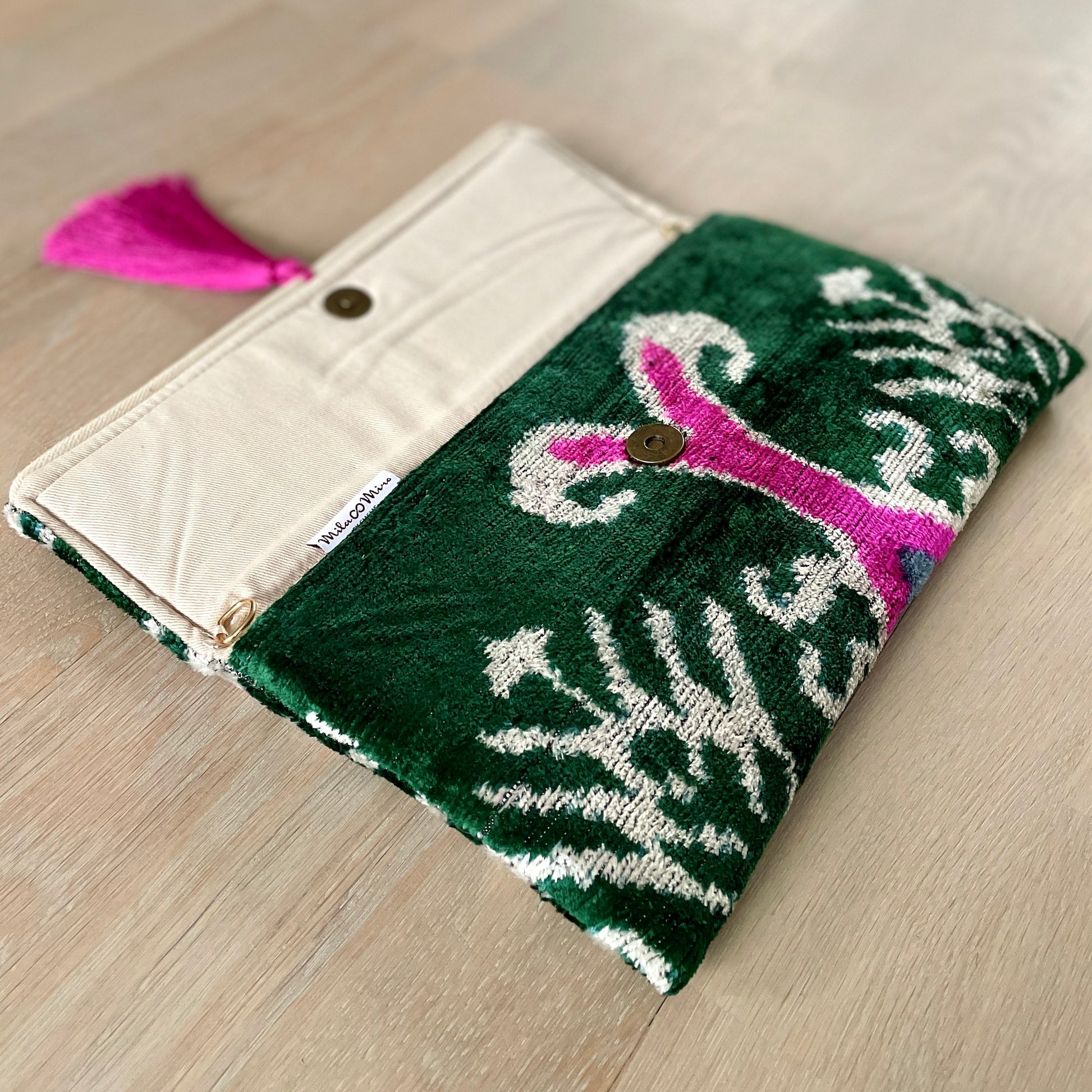 Chic clutch bag in handloomed fabric · Lightweight, soft and suitable for phone, keys, purse · Made of 100% silk velvet ikat · Magnetic snap closure, silk tassel · Comes with a gold chain · Size 17x30 cm / 6.7"x11.8"